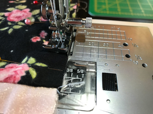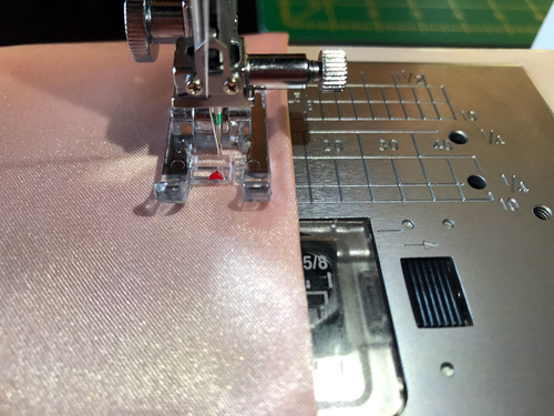 - Using a ½” seam allowance, stitch again along the side and across the bottom, again pivoting at the corner. We switched back to our Satin Stitch foot for this seam.