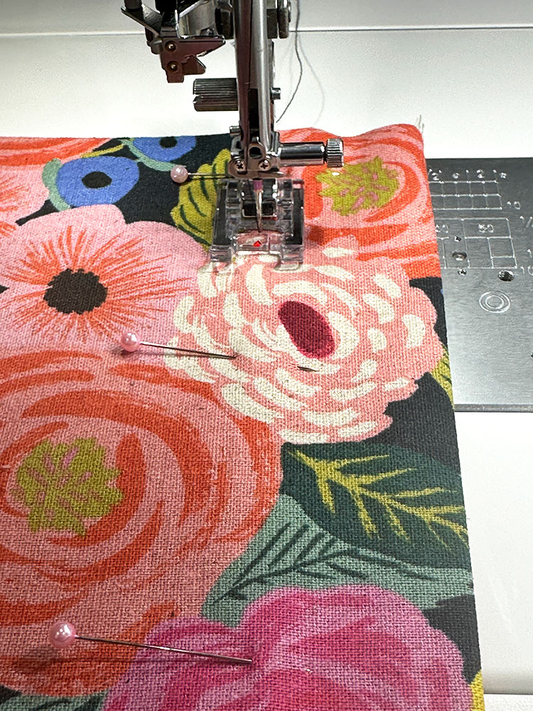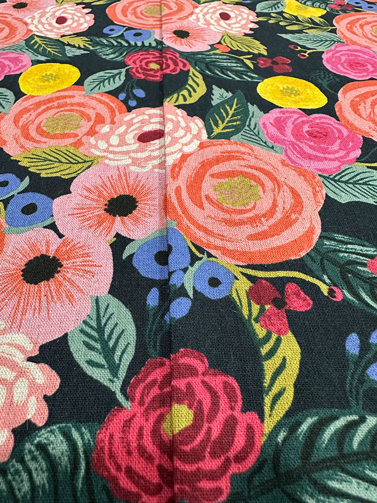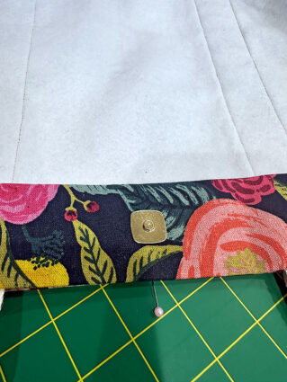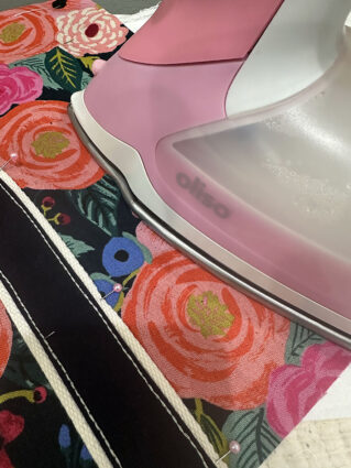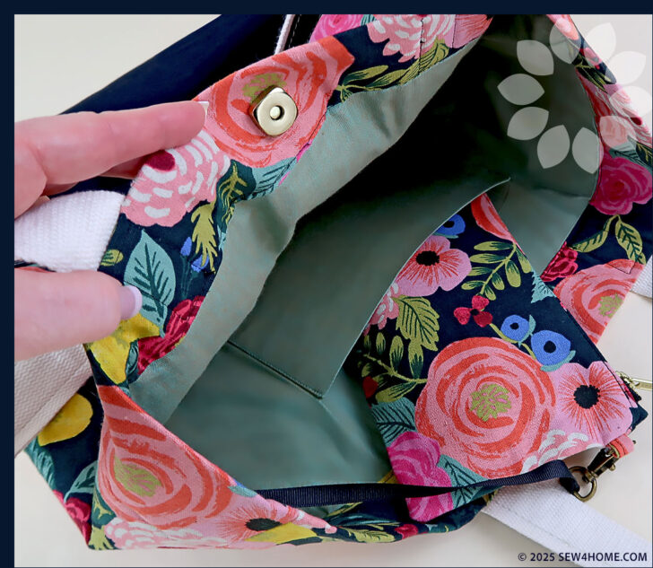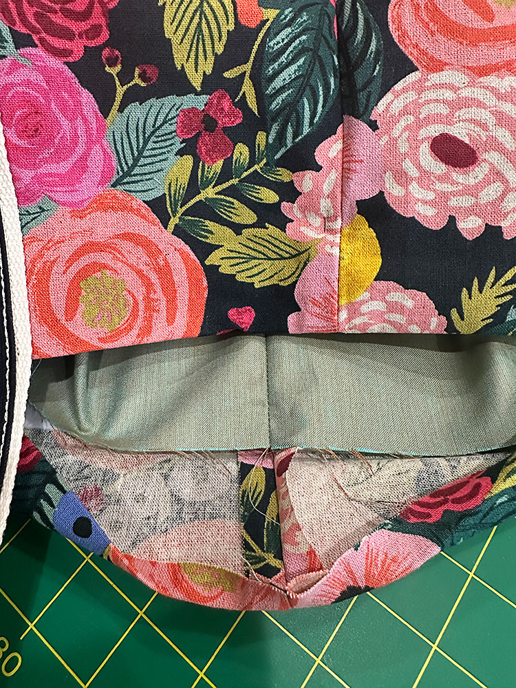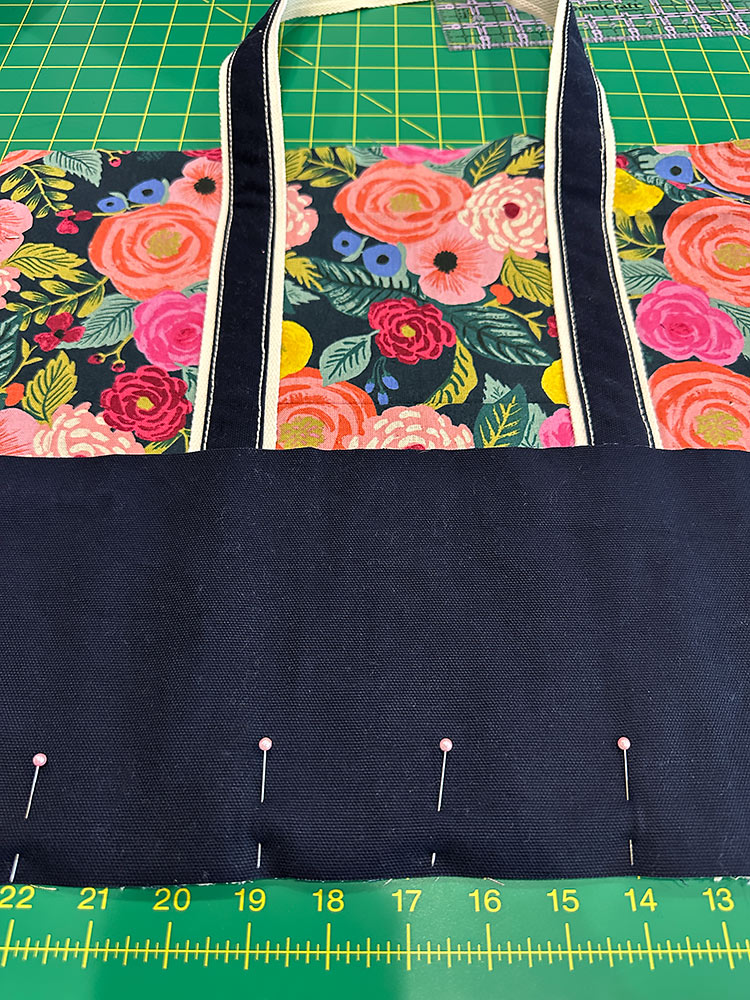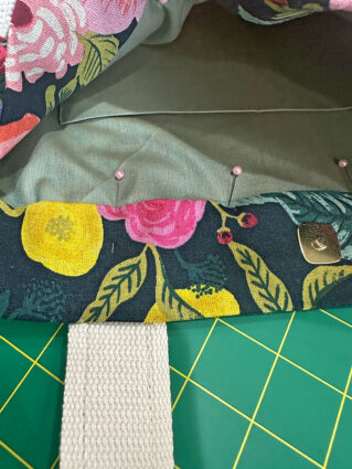The fabric combination we chose features a mid-weight canvas in an eye-catching floral with a heavier-weight solid canvas for the base panels. Make sure to click through to our full tutorial on how to perfectly match the front pocket to its background panel. Inside is a standard quilting cotton. When selecting your lining fabric, we recommend going with a light color – especially in a generously sized tote like this one. It can be frustrating enough to find smaller items in a bigger bag, but add in the challenge of dark fabric and the frustration level doubles!