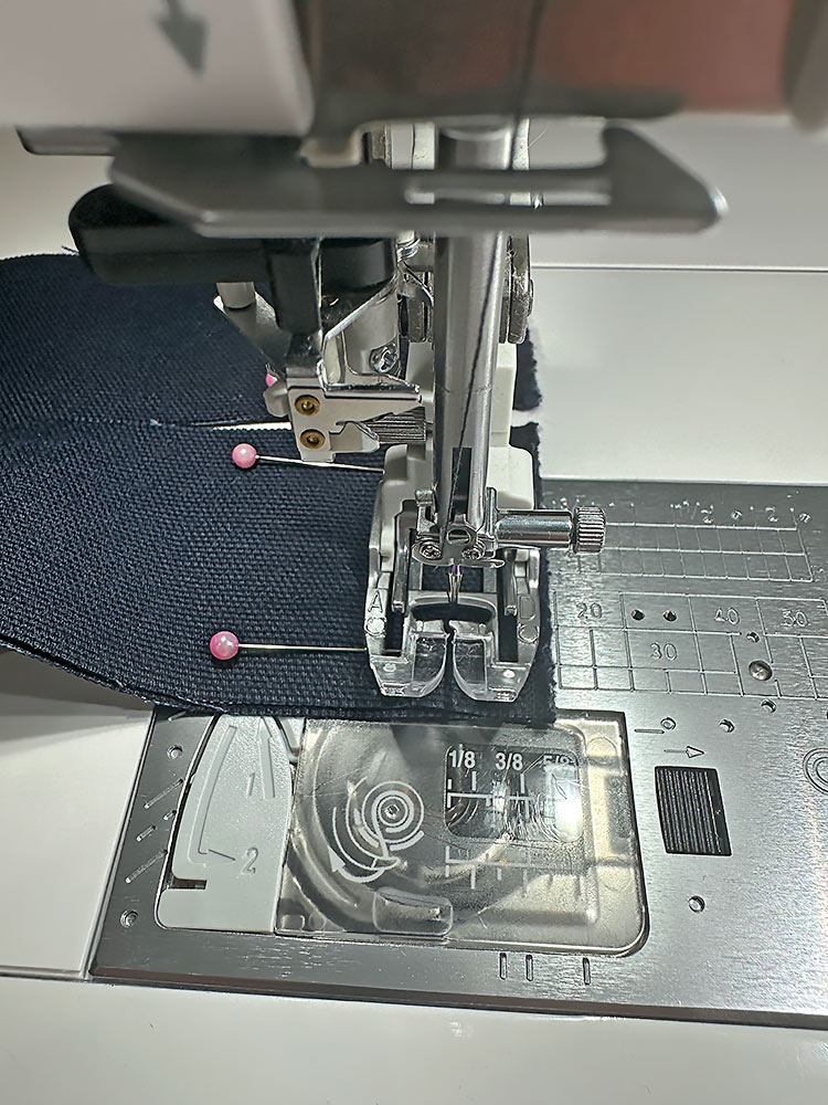 NOTE: If you find it difficult to pin through the thicker layers, you could use clips (we like Wonder Clips). Or you could use a fusible seam tape along the back of each canvas strip to adhere it to the webbing without needing pins or clips. - Thread your machine with the contrasting thread you chose for the canvas topstitching – we chose an off-white for our navy canvas,