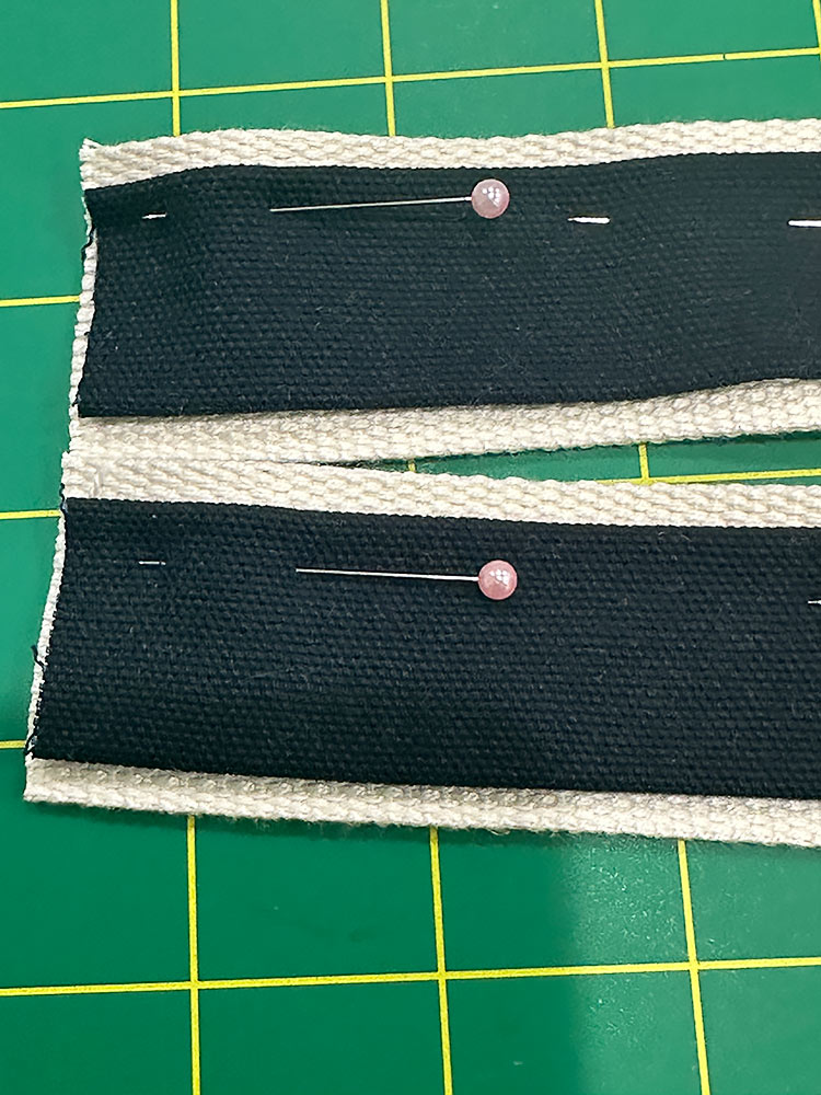 - Center a pressed canvas strip on each length of webbing. The raw ends of the webbing and the raw ends of the canvas strip should be flush; the seam of the canvas strip should land at the center of the length of the webbing (at 24½”).