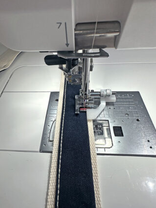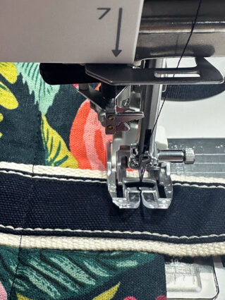 - If possible, attach a Janome Bi-Level foot. This gem of foot has two levels to accommodate varying fabric layers. These split levels guide the foot, creating a consistent line of edgestitching or topstitching. It is perfect for webbing straps like these.