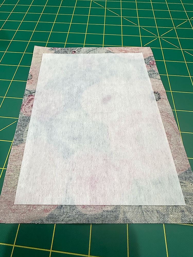 NOTE: As mentioned above, we pattern-matched one pocket panel to the front exterior panel so this is our pocket front. If you chose not to do this, simply choose your favorite panel of the two to be your pocket front. - Center the interfacing on the front pocket panel so there is ½” of fabric showing beyond the interfacing on all four sides. Following manufacturer’s instructions, fuse in place.