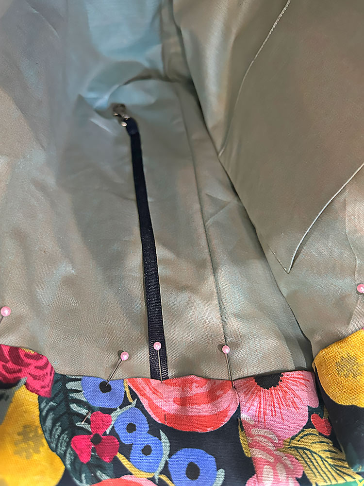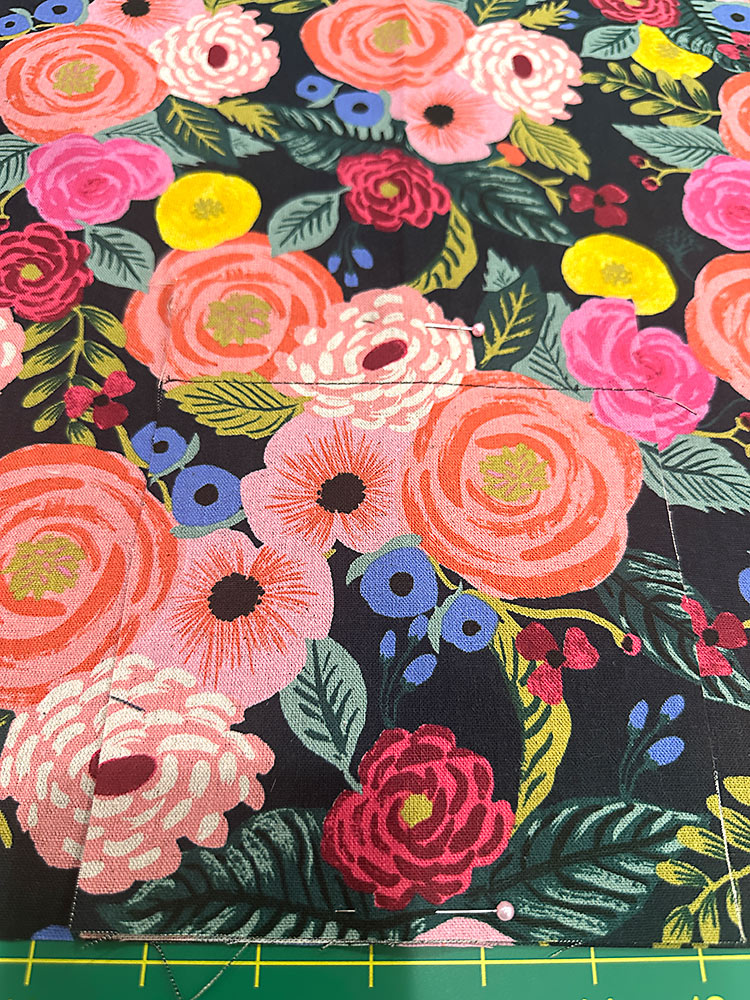 - Place the finished pocket in position. The pocket should be centered side to side on the main panel and the bottom raw edges of the pocket should be flush with the bottom raw edge of the panel. Of course, if you went to the trouble to pattern-match your pocket, it will be super easy to align the motifs. Lightly pin the pocket in place at the center top and center bottom.
