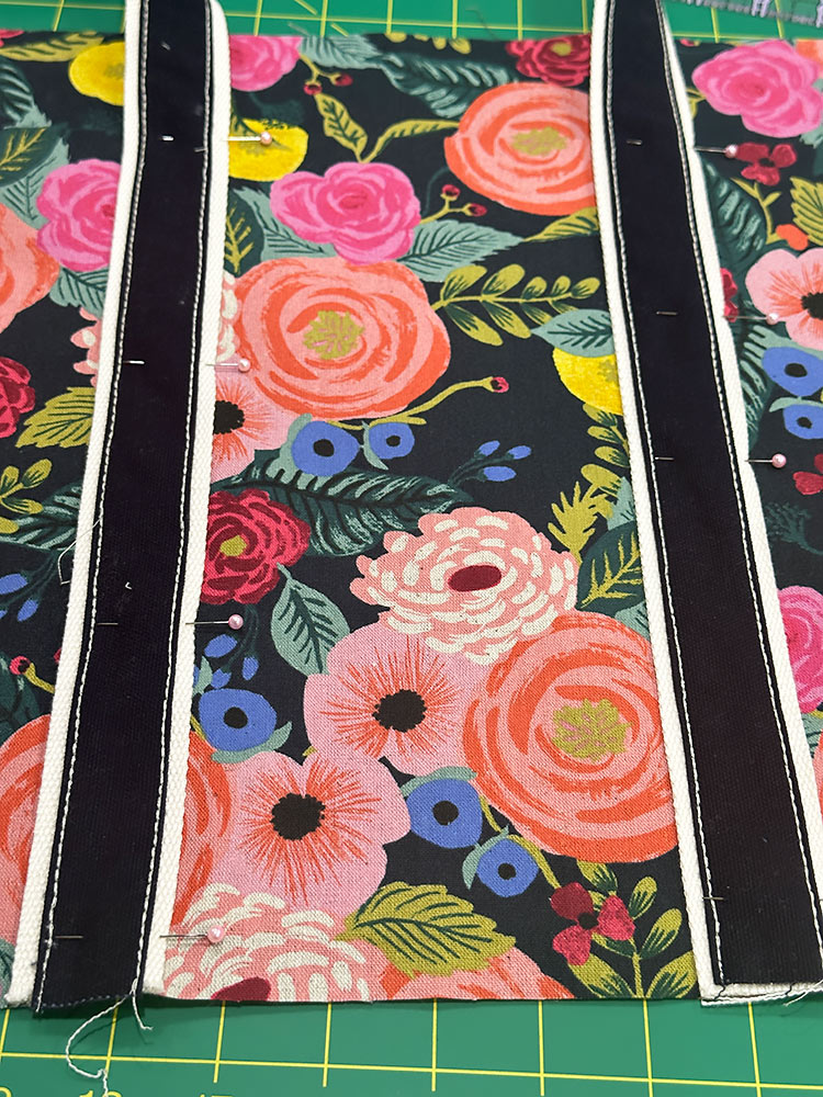 - Make a loop and come down the opposite side of the pocket. On this side, the pins start at 2½” from the top edge of the panel and continue down to the opposite end of the strap, which is flush with the bottom raw edge of the panel. Double check to make sure there are no twists in your handle loop. Then double check that the two sides of the webbing are parallel with 5” between their inner sides.
