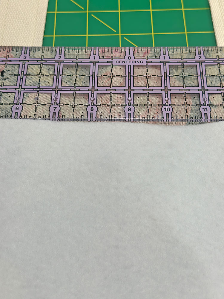 - Unfold the pocket panel and place the interfacing. The top of the interfacing should sit right up against that crease line. Along the sides and bottom, there should be ½” of fabric showing beyond the interfacing. Following manufacturer’s instructions, fuse in place.