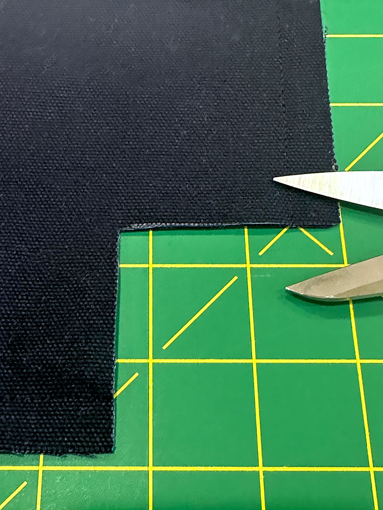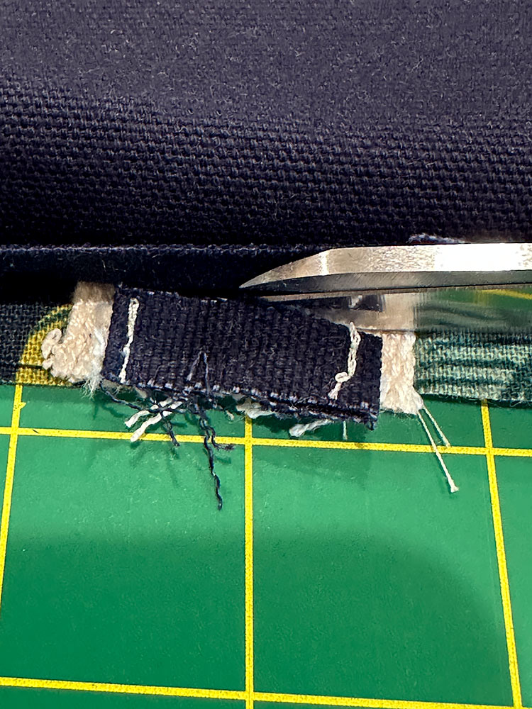 - At each of the bottom ends of the webbing, trim away the canvas from the webbing to help decrease the thickness. It should easily pull away from the webbing, but you can pull out your seam ripper to loosen the original topstitching if necessary.