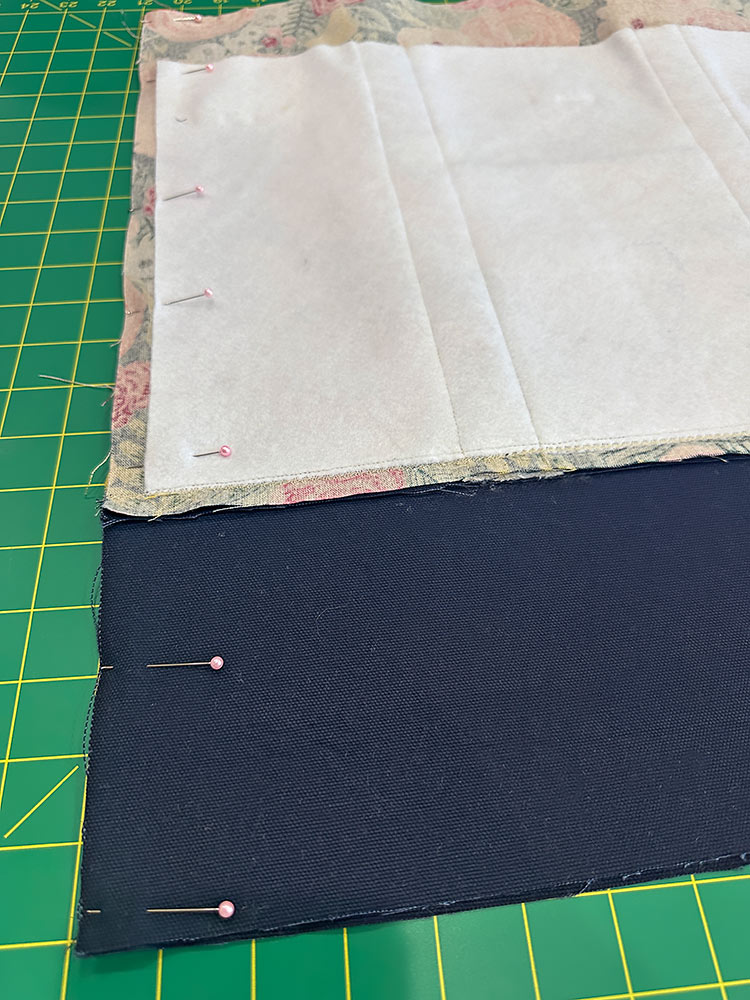 - Place the front and back lining panels right sides together, sandwiching the pocket between the layers. Pin along both sides and across the bottom.