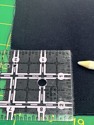 - Refold the facing and center a washer at the pin point. The center of the wash should sit 1” down from the top folded edge of the tote.