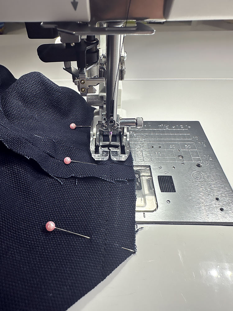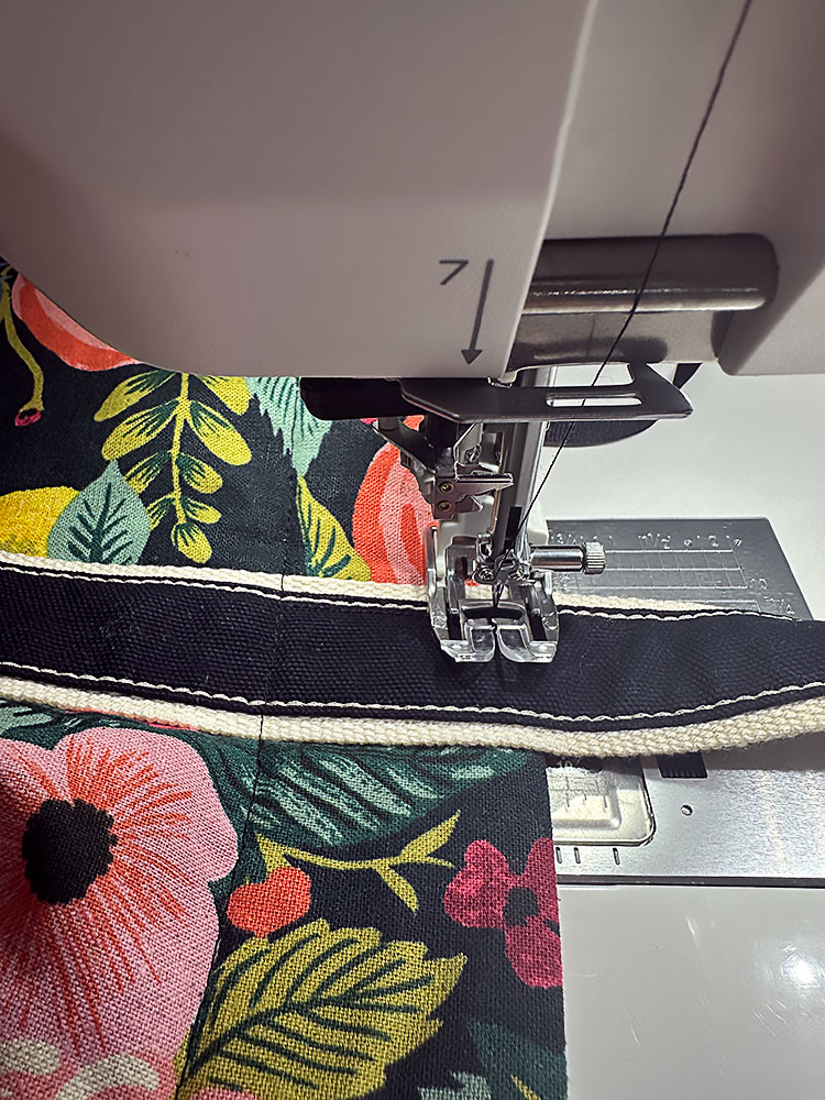 - Re-thread with thread that best matches the exterior fabric as well as blends with the canvas accent strips on the handles. We went with black thread. Re-set for a slightly lengthened straight stitch. If your machine has a free arm, now is a good time to use it.