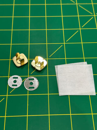 - Find the two halves of the magnetic snap and the two squares of interfacing.