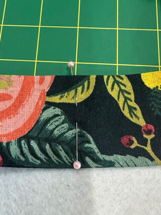 - Refold the pocket panel in half again, but this time it should be right sides together. Pin along both sides and across the bottom, leaving an approximate 2” opening at the center of the bottom seam for turning.