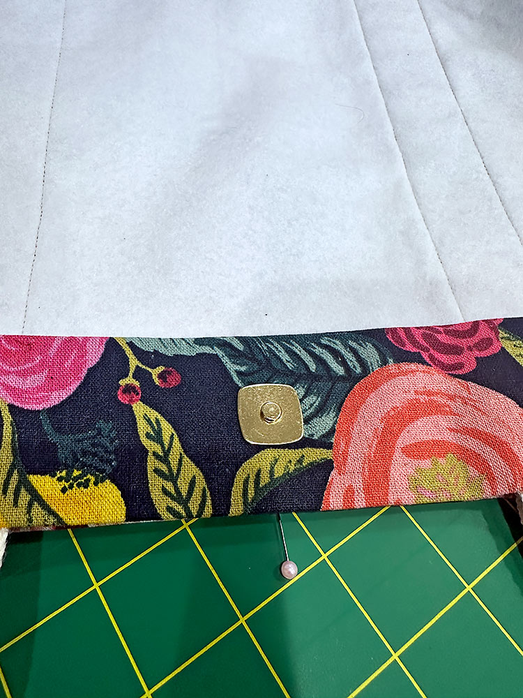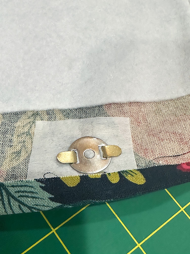 - Lift up the facing and fuse a square of interfacing behind it. This provides a bit of stabilization for the heavy magnetic snap.
