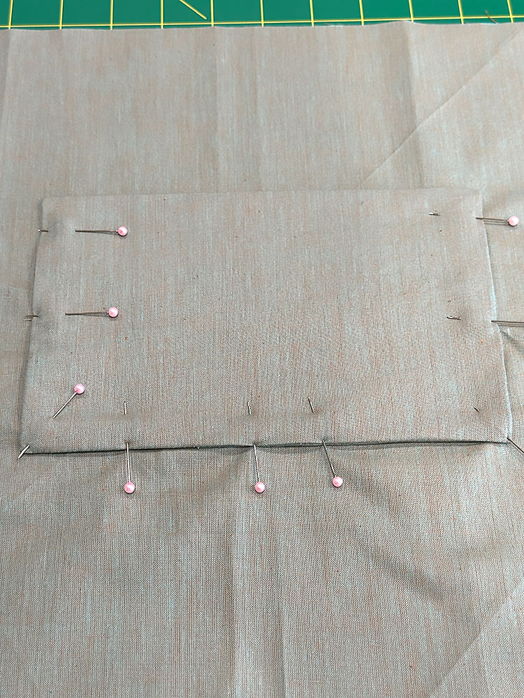 - Place the pocket into position. The folded edge is the top of the pocket. The interfaced side of the pocket should be facing out. Center the pocket side to side, 4” down from the top of the panel. Pin in place along both sides and across the bottom.