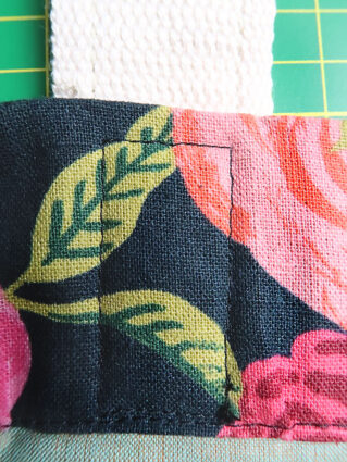 - Edgestitch along the right and left sides of both ends of the webbing straps on both the front and back panels. You are stitching just along the webbing – do not stitch onto your canvas strip.