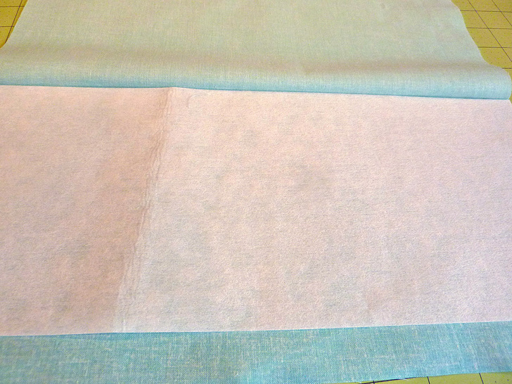 - Unfold it, wrong side up, so you can see the crease. Place the 14″ x 6″ piece of interfacing on the bottom half, aligning the top of the interfacing with the crease line. Following the manufacturer’s instructions, fuse in place.