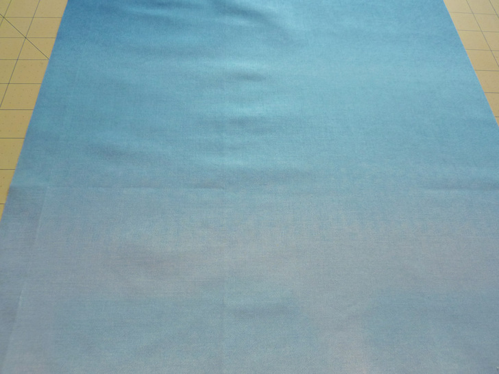 - Find the 14″ x 14″ bottom pocket piece (the Aquatic Blue Ombre in our sample). Press it in half so the medium color range is showing and it is now 14″ x 7″