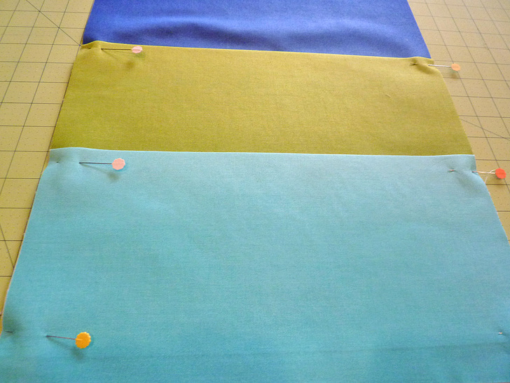 - Place the bottom pocket on the middle pocket so the middle pocket reveals exactly 5″ above the top of the bottom pocket. Pin in place.