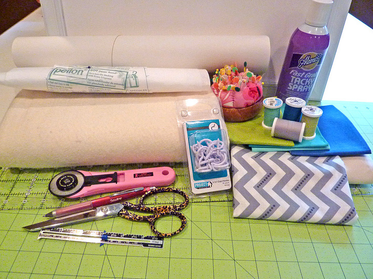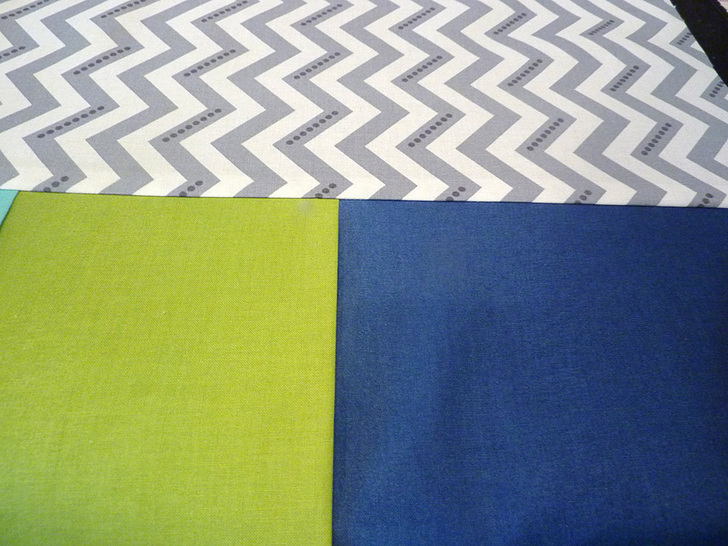 Fabric for three pockets: Simply Color Metro Ombre in Navy Blue (Moda #10800-20), Lime Green (10800-18) and Aquatic Blue (Moda #10800-19) - ONE 18″ x 24″ ¼” thick sheet of foam core; available at art supply and craft stores – even most office supply stores