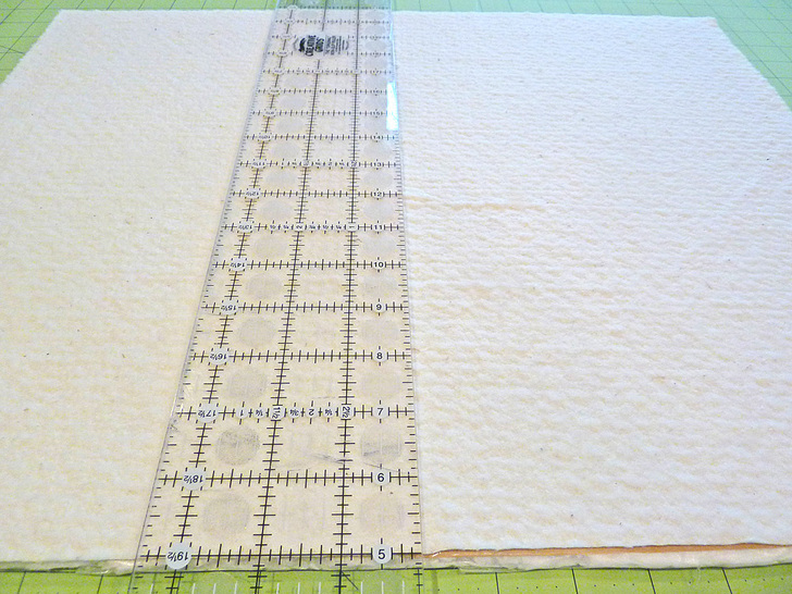 - Using your clear ruler and a fabric marking pen, draw a light-colored line down the center of the batting to use as guide to center the front panel.