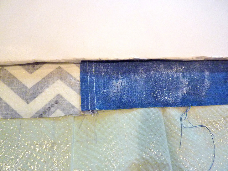 - Adjust the foam core so your drawn guide line on the batting aligns with the center seam of the panel. Then, the other critical measurement is to insure that, after wrapping, the bottom pocket is 5″ deep so it exactly matches the middle pocket. Use the mark you made on the front panel to adjust the bottom edge.