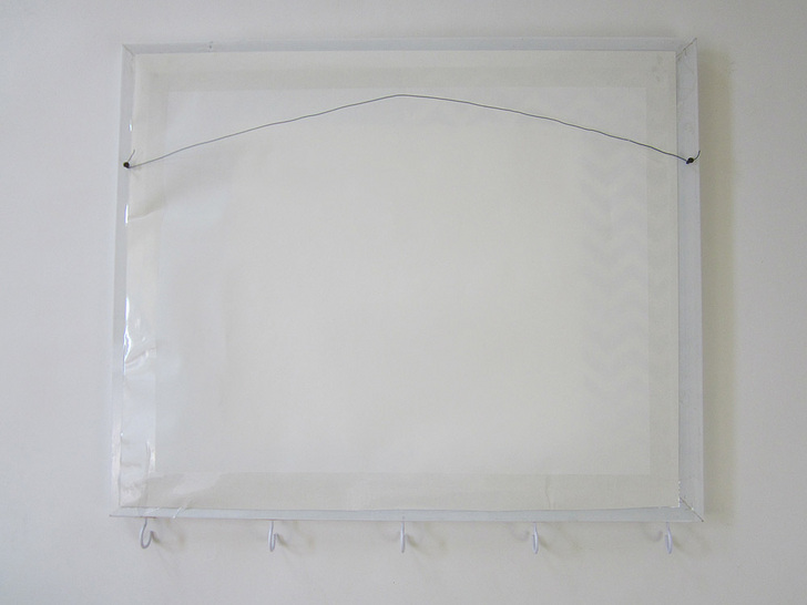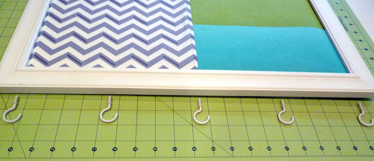 NOTE: For an even cleaner finish, you could skip the tape, apply spray adhesive to all four sides of the back of the frame, and carefully roll the paper into place, pressing down to secure. The spray adhesive will look wet for awhile and may bleed through the paper, but it dries quickly and any darkness or discoloration from the bleed-through will disappear. - Mark the bottom of the frame for the placement of the cup hooks. They should be evenly spaced across the bottom.