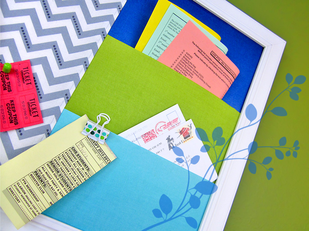 People in general, and kids in particular, generate lots of bits and pieces of stuff: important forms, special coupons, lucky tickets, keys to long forgotten locks… there really isn’t another word for it. If you look up “stuff” in the dictionary, there’s probably a picture of the top of your desk! Keep your counters and other work surfaces tidier and your stuff more organized with a pretty framed pinboard. We found our simple white frame at a local craft store, however, you could also look at second hand shops or garage sales for old framed art; remove the art and replace it with your cool pinboard. The project uses just four Fat Quarters to create the front panels and pockets, and thanks to the variety within the Simply Color Collection by Vanessa Christenson for Moda, we had plenty of colors and patterns to choose from to perfectly match our décor.