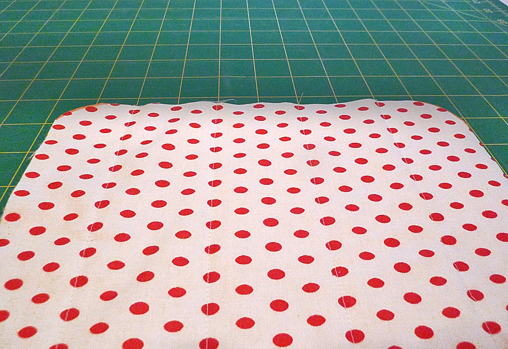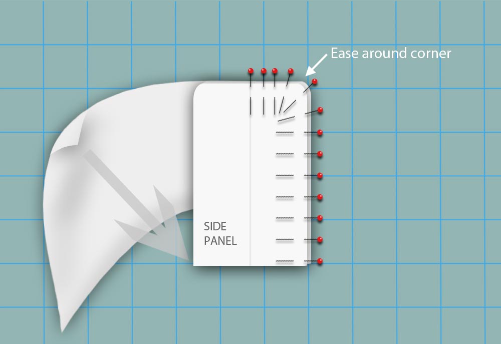 - Fold the main panel down, easing it around the rounded corner of the side panel, and continue pinning the two layers right sides together. The bottom of the main panel should match up perfectly with the bottom square corner of the side panel.