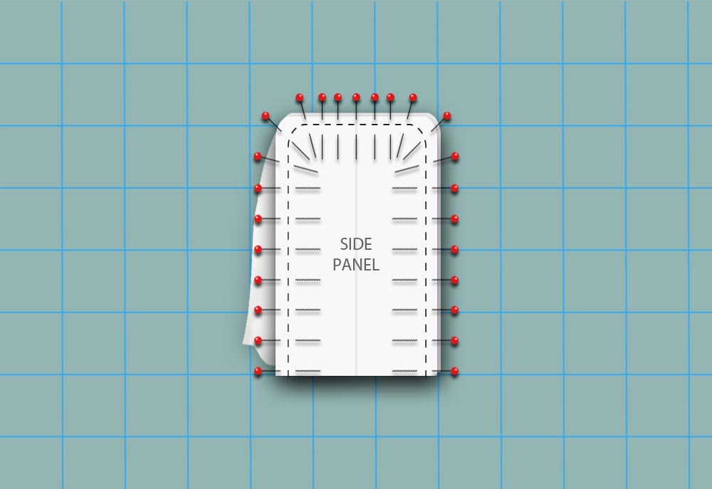 - With right sides together, match the center mark at the top of one side panel and the center mark on main panel, aligning the raw edges. Pin in place.
