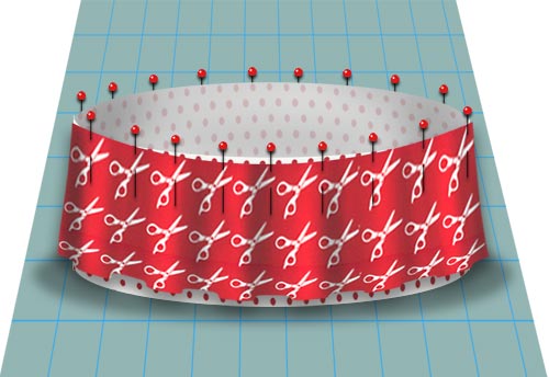 - Slip the ruffle ring over the right side of the bottom exterior ring, alining the top raw edges. There are actually four layers of raw edges: the two layers of the ruffle ring, the exterior fabric and the batting. Pin in place all around the ring.