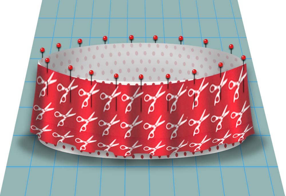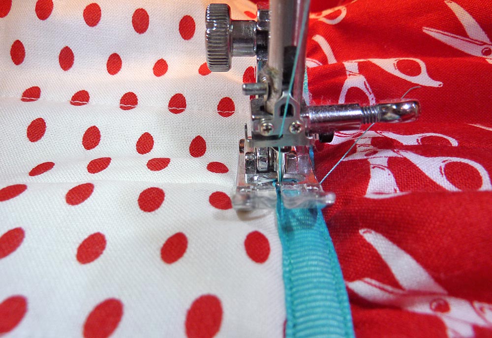 - Using this pin as your starting point, lay the accent ribbon over the ruffle seam so the bottom of the accent ribbon falls into the seam. This gives you a kind of ‘groove’ to follow to help keep the ribbon straight. Pin the ribbon in place all the way around, trimming off the end as necessary to just overlap your starting point.
