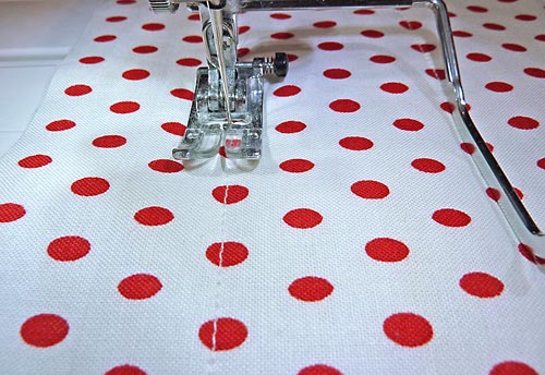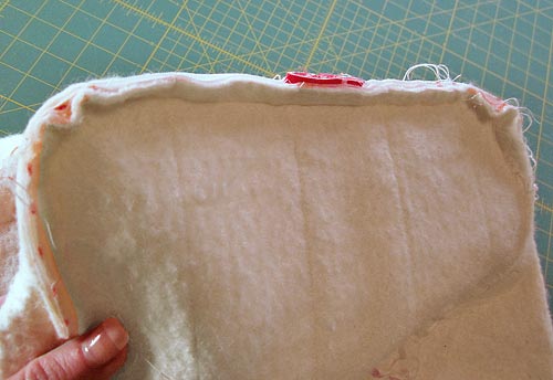 Unlike a lined bag where the force of gravity helps keep the lining in place, the lining of this sewing machine cover will want to drop out when you lift the cover off the machine. To help hold it in place, hand stitch through all the layers at either end of the handle. From the front, you can hide your stitches within the seam top side panel seam, right along the base of the handle.