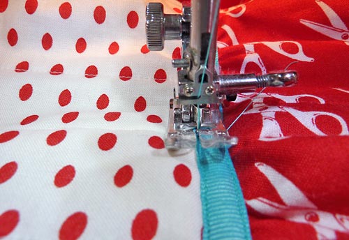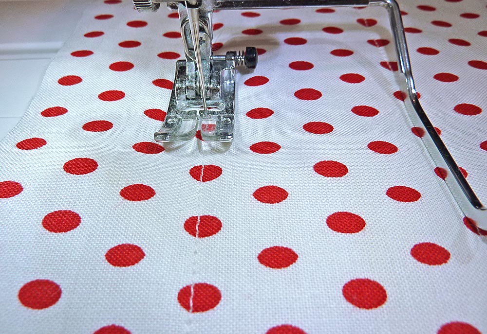 - Topstitch all around the bottom to reinforce the bottom edge and close opening. You’ll need to flip the ruffle up out of the way for this seam.
