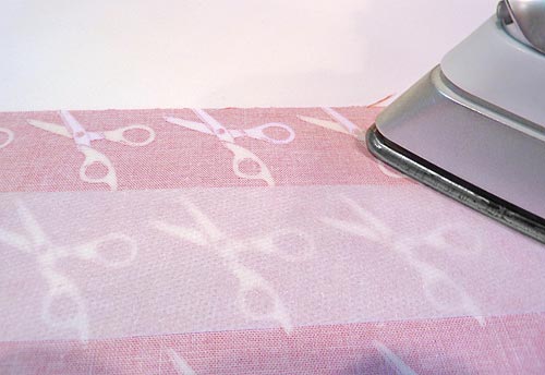 - Following manufacturer’s instructions, fuse the 1½” x 20″ interfacing strip to the wrong side of the 20″ x 4″ handle strip. The interfacing strip should be positioned so it is directly behind the fussy cut row that will become the handle’s top. In our sample, we fused the interfacing directly behind our center row of scissors.