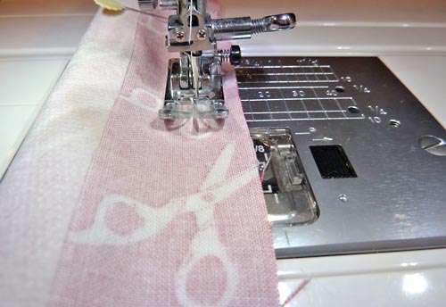 - With the interfacing fused in place, fold the strip right sides together lengthwise. Pin in place along the one long edge, leaving both ends open. Stitch along the long side, using a ½” seam allowance.