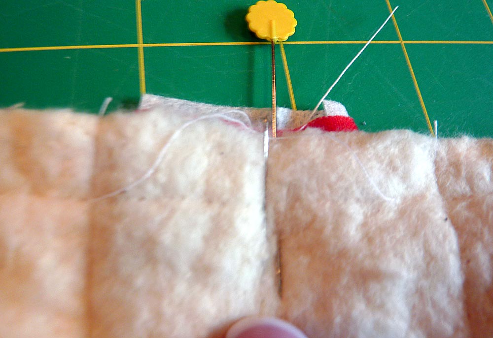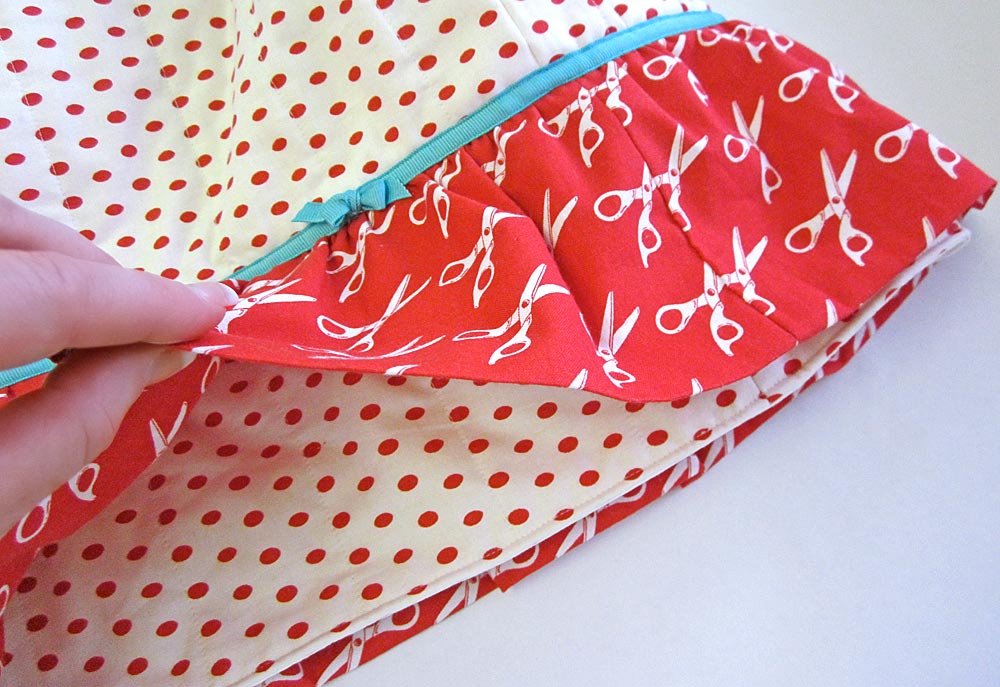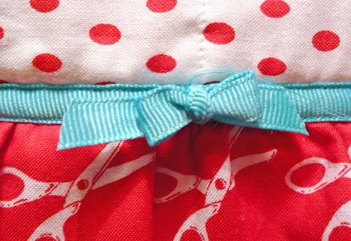 - Using the ‘fork method’ we introduced in our Cocktails At Eight Hostess Apron tutorial, make a tiny bow from the ribbon and hand stitch it in place, concealing the ribbon overlap.
