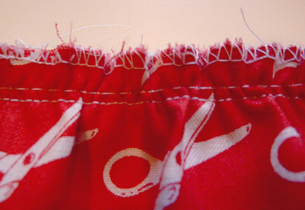- Find the two TWO 37″ x 10¾” ruffle fabric strips (Scissors Red in our sample).