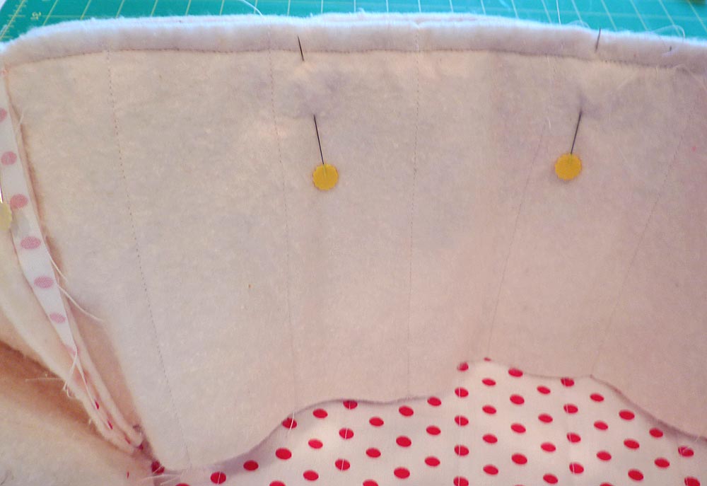 - Pin the finished handle, right sides together, to this quilted exterior piece. Matching the back seam of the handle with the center pins on the exterior. Pin or machine baste the handle in place.