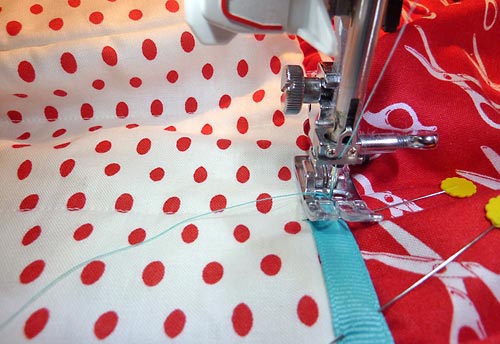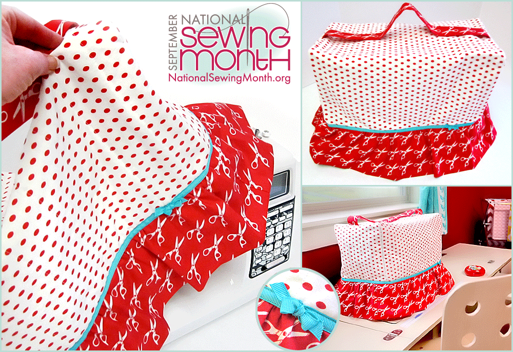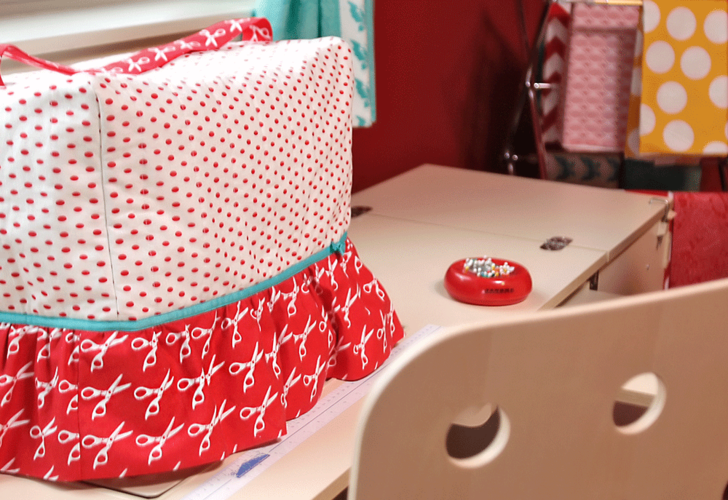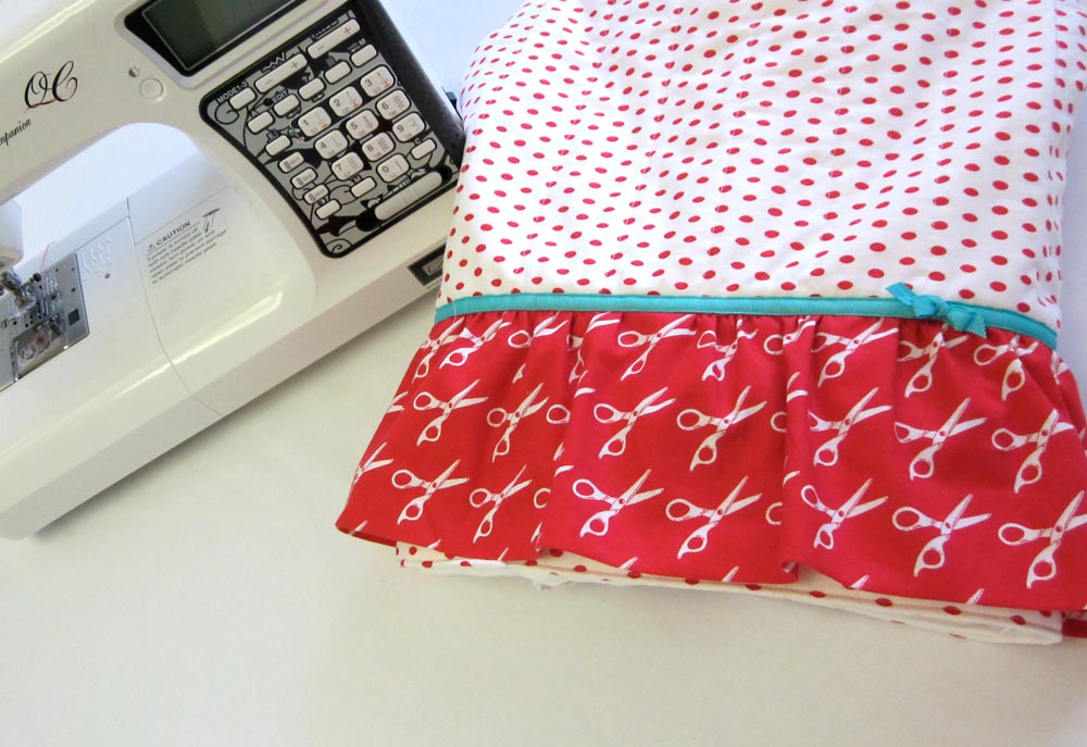 In honor of National Sewing Month… or really ANY month, maybe you should do something sweet for your trusty sewing machine, like make it a little outfit! Many sewing machines come with a cover; some are hard plastic, some are soft vinyl… none are particularly pretty. Since we believe all our sewing machines have their own personalities, we think they deserve their own personalized covers to keep them protected from dust and sun exposure when not in use. Besides, these hard-working machines make so much stuff for us, the least we can do is make a little something for them! Our sample cover was created for a Janome Memory Craft 5200, a very standard-sized machine. This Janome is a mid-range model and a real sweetie-pie. She deserved a cover with a kicky bottom ruffle and a bright turquoise ribbon accent.