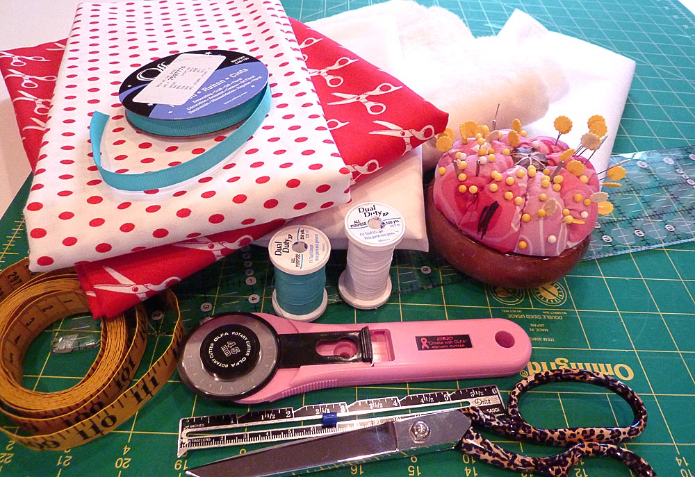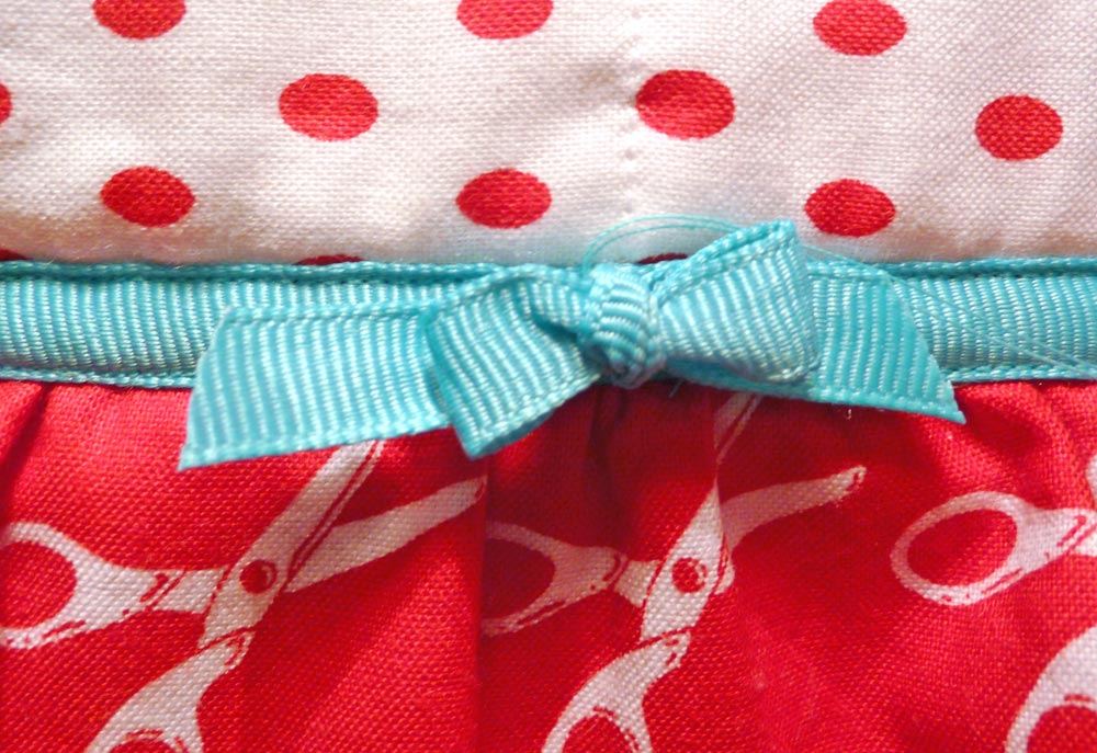 - ¾ yard of 44″+ wide fabric for the accent ruffle and top strap: we originally used Half Moon Modern by Moda Fabrics in Scissors Red