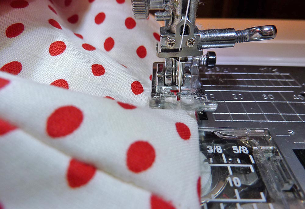 - Using a ⅜” seam allowance, stitch all the way around the ring through all the layers. If you stitch with the ruffles on top, you can follow the ⅜” machine basting line. Stitching with the ruffles on top also helps make sure your ruffles stay even and flat.
