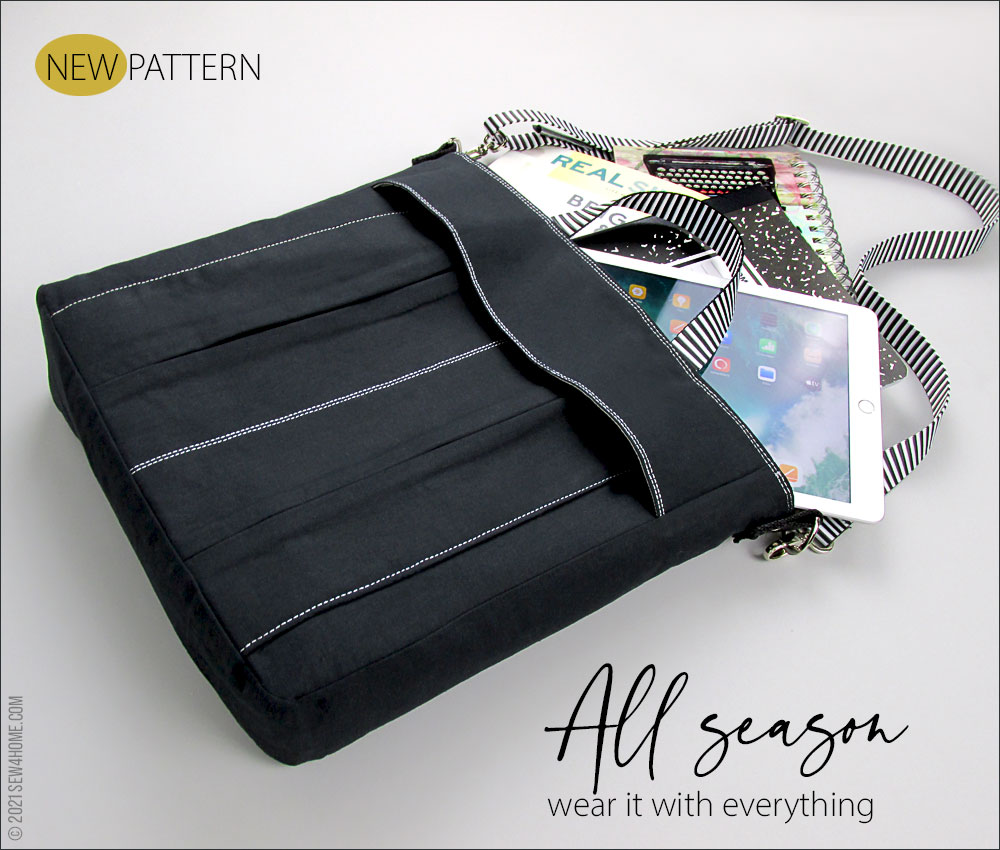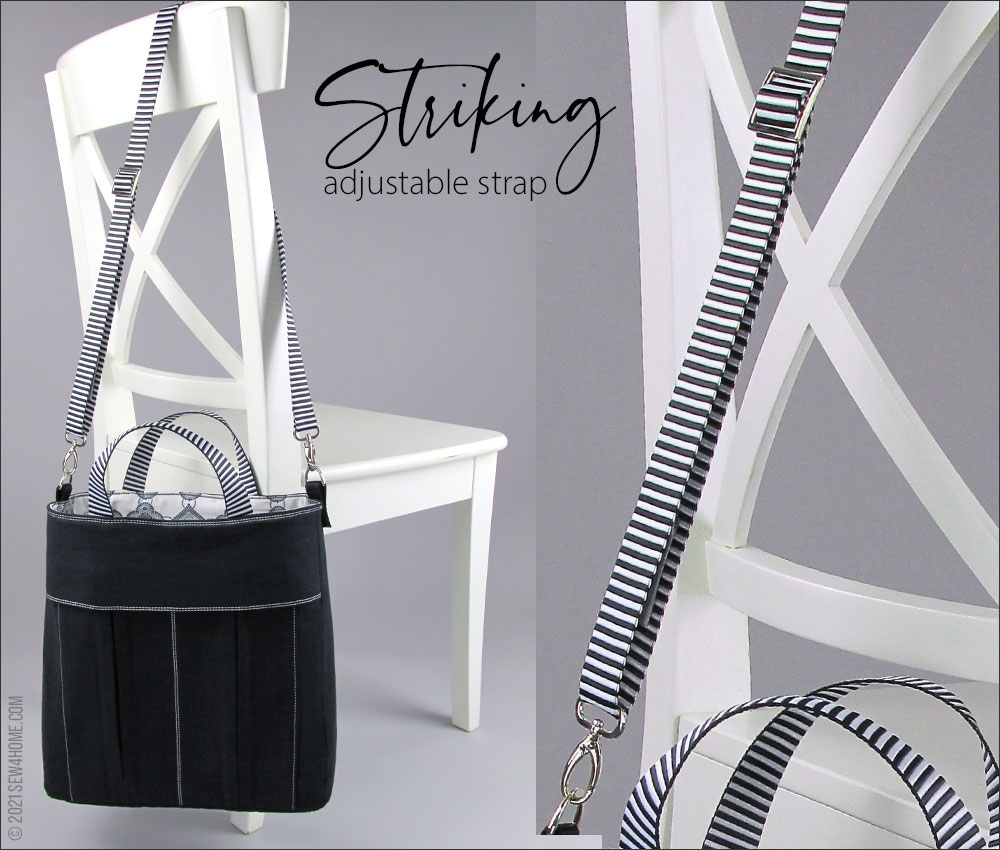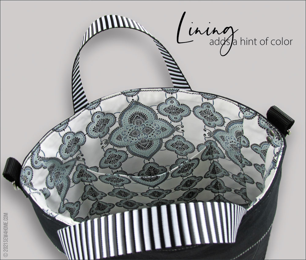 This tote can be carried with the looped handles or over the shoulder or cross body with the adjustable strap. The strap can also be completely removed. There are D-ring tabs riveted at each side and swivel clips at each end of the strap.We recommend a standard polyester webbing in a color to match your solid exterior for those side D-ring tabs, but you can then go all out with a patterned webbing for the handles and strap. We chose a heavyweight nylon webbing in a bold black and white stripe from Renaissance Ribbons. The stripes echo the clean lines of the bag itself. This webbing is a super popular item, which tends to sell-out now and then, but don’t be deterred; Renaissance Ribbons can always notify you when it’s back in stock.