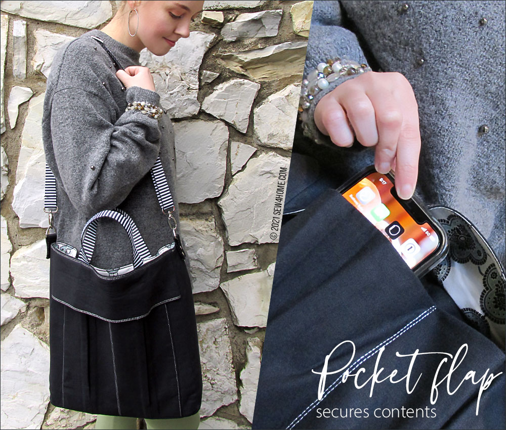 - Find the finished flap. You will notice it is slightly wider than the main panel itself. This is purposefully designed so the flap covers the top of the pocket yet bows out slightly so it’s easier to lift up the flap and reach in to retrieve the contents from either pocket.