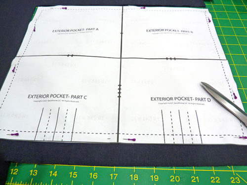 - For the front pocket pattern, aligning the printed arrows, assemble the FOUR pieces into the complete pocket pattern; you’ll notice there are handy guides printed on the bottom two pieces indicating pleat placement. A center seam line within construction will divide the pocket panel into two sections.