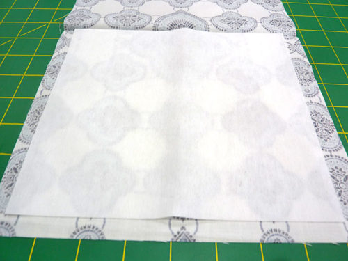 - Center the 3” x 50” fusible fleece strip on the wrong side of the 4” x 50” exterior sidewall strip. There should be ½” of fabric showing beyond the fleece along each long side, but the fleece and fabric will be flush at the ends. This is because the strip will be cut to precisely fit during construction. Following manufacturer’s instructions, fuse in place.