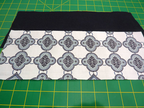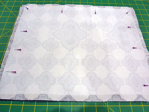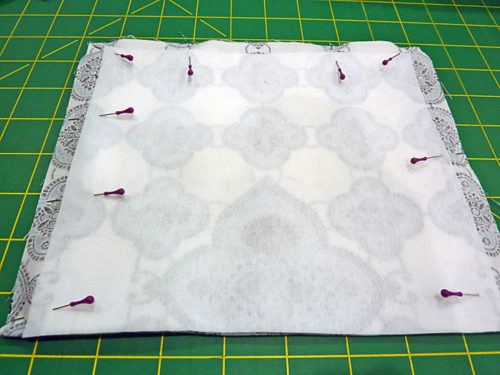 - Place the two panels right sides together aligning all raw edges. Pin along the bottom edge only (the longest side).
