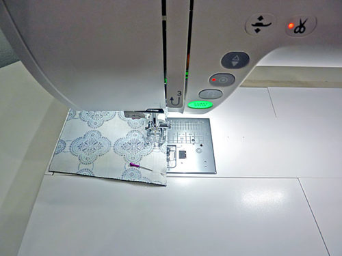 - Stitch from the bottom raw edge up to the 2” marked point. You are stitching 1” in from the folded edge. Make sure to backstitch or lock stitch at the top of the seam.