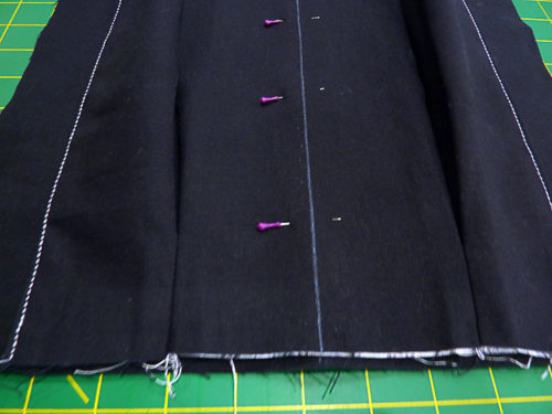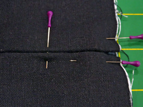 - Using the pattern once again as your guide, mark the upper limit of the stitching, which should be the length of the pleat lines – 2” up from the raw edge. You can see in the photo below that we both placed pins to hold our flattened fold and used a marking pencil to place a dot at the 2”-up measurement.