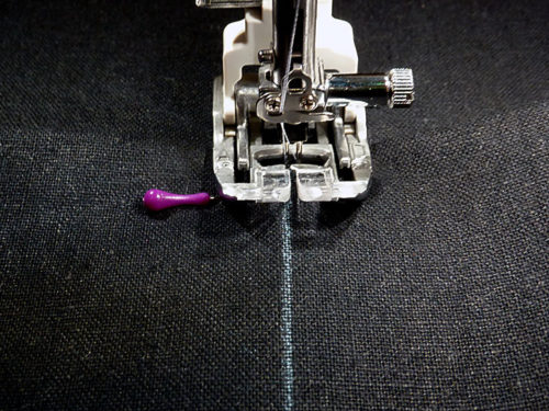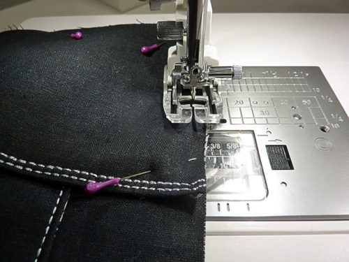 - Keep the machine threaded with the heavier-weight contrasting thread in the top and all-purpose black in the bottom. Change out from a standard needle to a twin needle.
