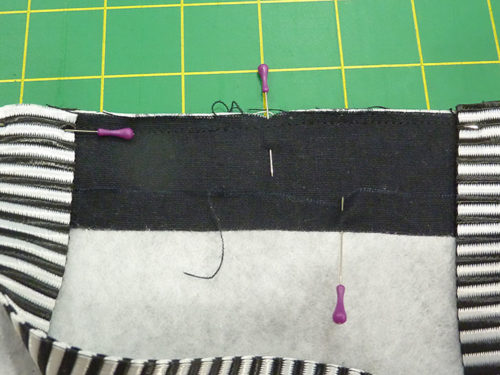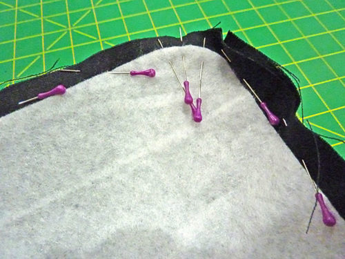 - Pin along the top and both sides; leave the bottom edge open, it will be secured later within the sidewall seam.