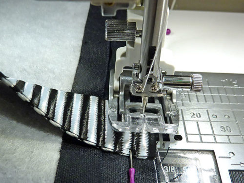 - Re-thread the machine with the heavier-weight contrasting thread in the top and all-purpose black in the bobbin. Re-set for a slightly lengthened Triple Stitch or similar.